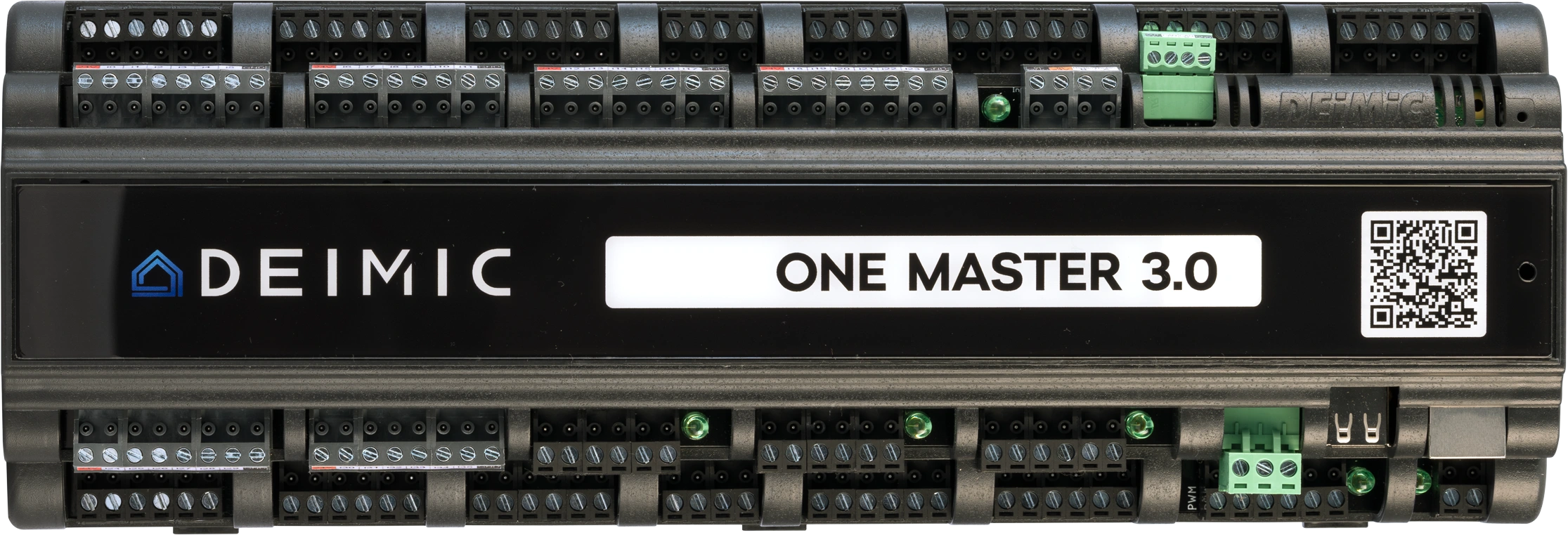 Le module Deimic One Master permet de contrôler tous les appareils électrotechniques dans le bâtiment. Il suffit de le connecter à une alimentation externe et à un réseau LAN pour que le système commence à fonctionner.